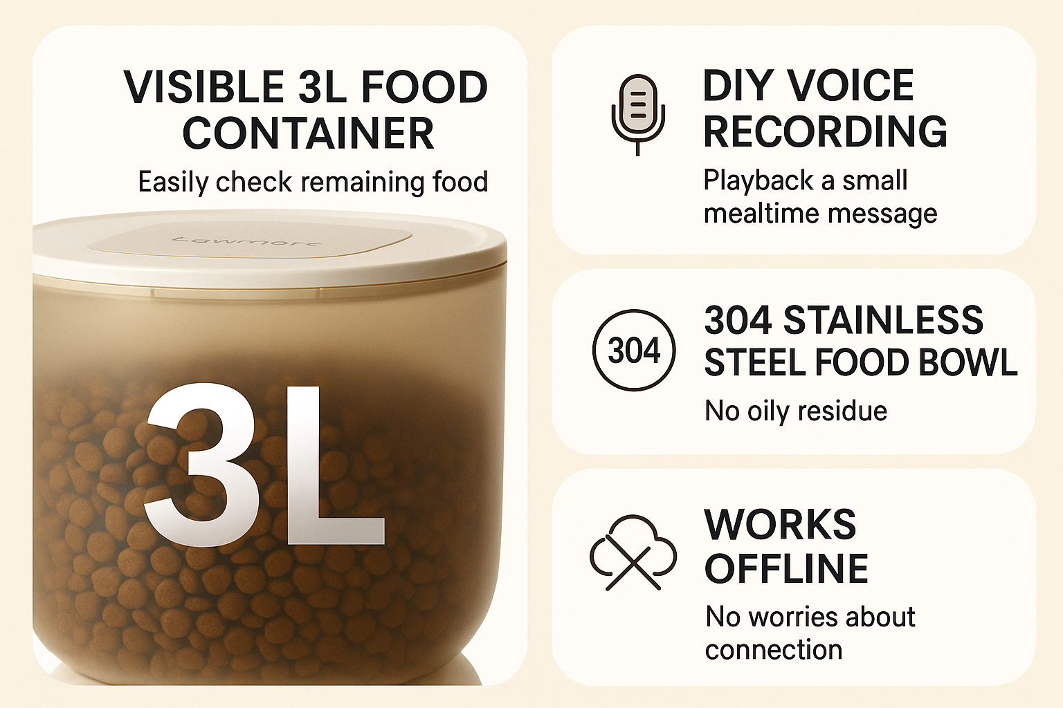 Record personalized voice messages to call your pets at mealtime, and enjoy peace of mind with its offline functionality—no need to worry about Wi-Fi connection. Its compact packaging design also reduces shipping costs, making it a smart choice for homes and retailers alike.